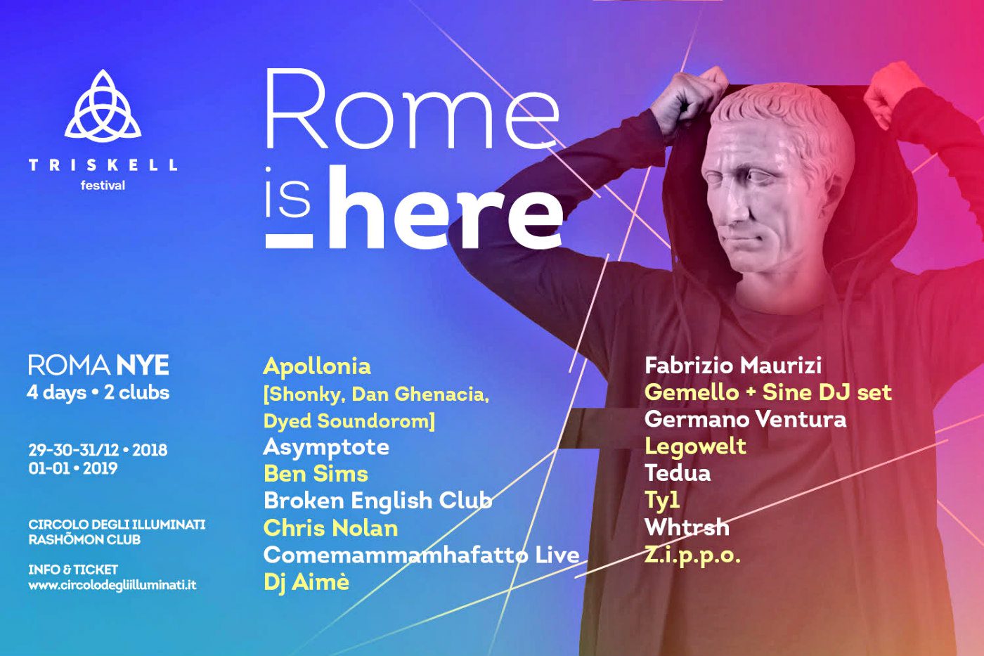 Per questa edizione il concept di Triskkell si espande in tre direzioni: per quanto riguarda gli spazi, dal momento che si svolgerà tra Circolo degli Illuminati e Rashõmon; come tempi, perché in questa edizione si aggiunge un giorno di manifestazione, dedicato a vinyl market, artigianato e performance di diverso tipo; per i generi musicali, in quanto la line-up si sdoppierà tra i due club.